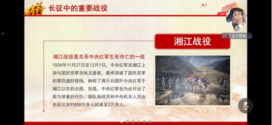 会议初始,各班主讲人以红军长征的历史背景为切入点,引导员工进入主题。随后,主讲人从长征精神的内涵及意义、长征中的关键战役、五种伟大的长征精神以及如何在新时代走好长征路等四个方面进行了深入的阐述,使同学们对长征精神有了更进一步的理解。最后,主讲人结合会议主题向全体同学发出倡议,新时代青年应当弘扬伟大的长征精神,树立远大的理想信念并坚定地为之奋斗,为构建更加美好的未来贡献青春力量。