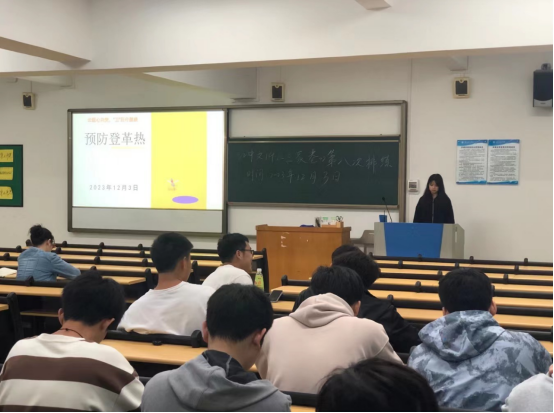 艾滋病讲解完毕后,各班主讲人又对同学们进行登革热传染病的预防讲解。主讲人先是介绍了登革热的疫情情况以及登革热的相关情况,包括概念、临床表现、流行病学特征、传播途径。讲解了传播登革热的蚊子——花斑蚊,以及登革热的流行期。在班会的最后介绍了登革热的科学预防。