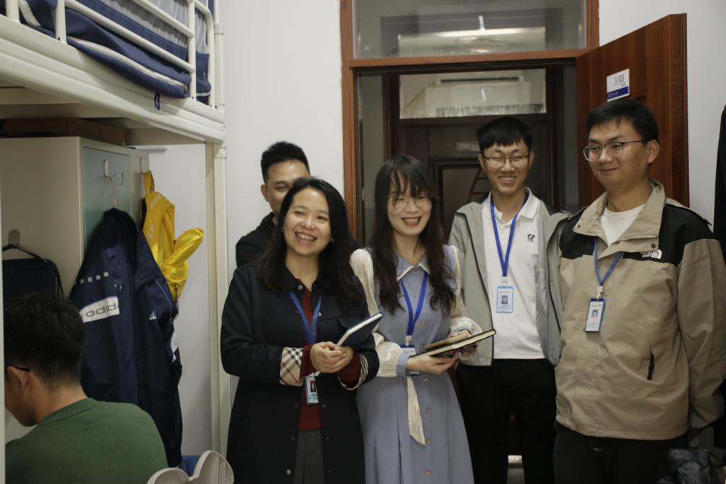 在惠州校区辅导员尚筱敏、张帅的带领下,杨惠书记与老师们一同前往员工宿舍,开展新学期查寝工作,了解他们的寝室生活。在走访宿舍的过程中,杨惠书记提醒同学们加强寝室清洁管理,保持宿舍环境卫生,宿舍内禁止使用大功率电器,并且在平常住宿生活中务必注意财产安全、用电安全和人身安全,谨防诈骗;并向同学们寄语要劳逸结合,关注身体健康与心理健康,鼓励同学们要以更加饱满的心态去面对新学期的学习和生活。