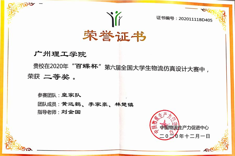 全国老员工物流仿真设计大赛获奖证书