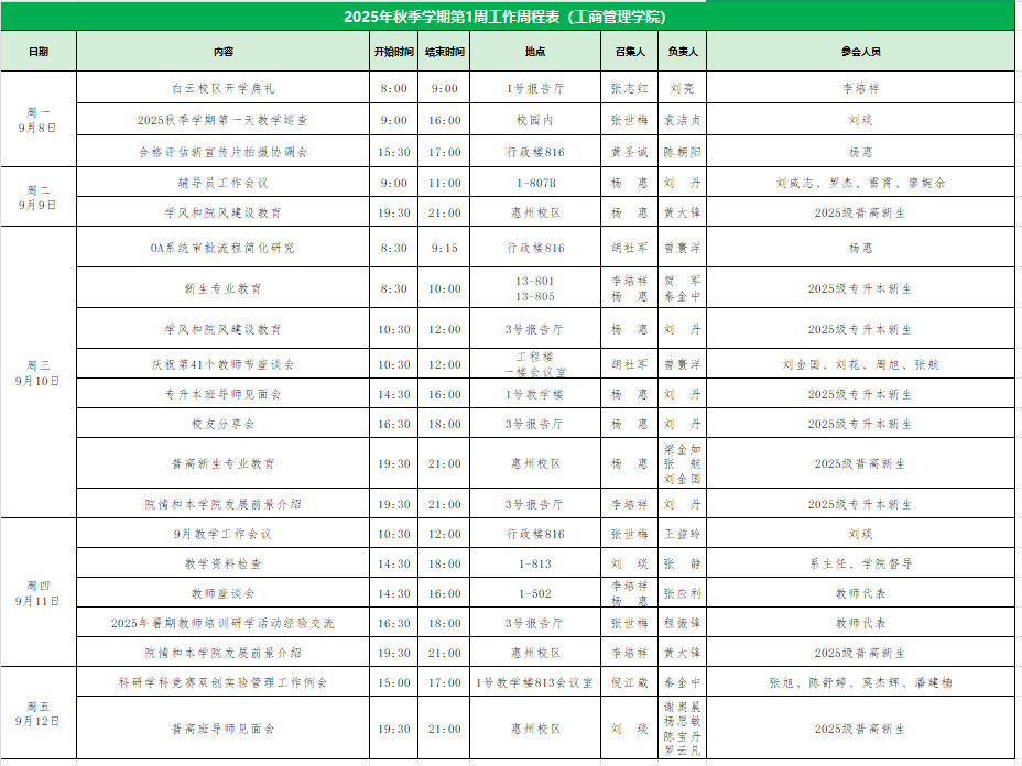 2025年秋季学期第1周工作周程表
