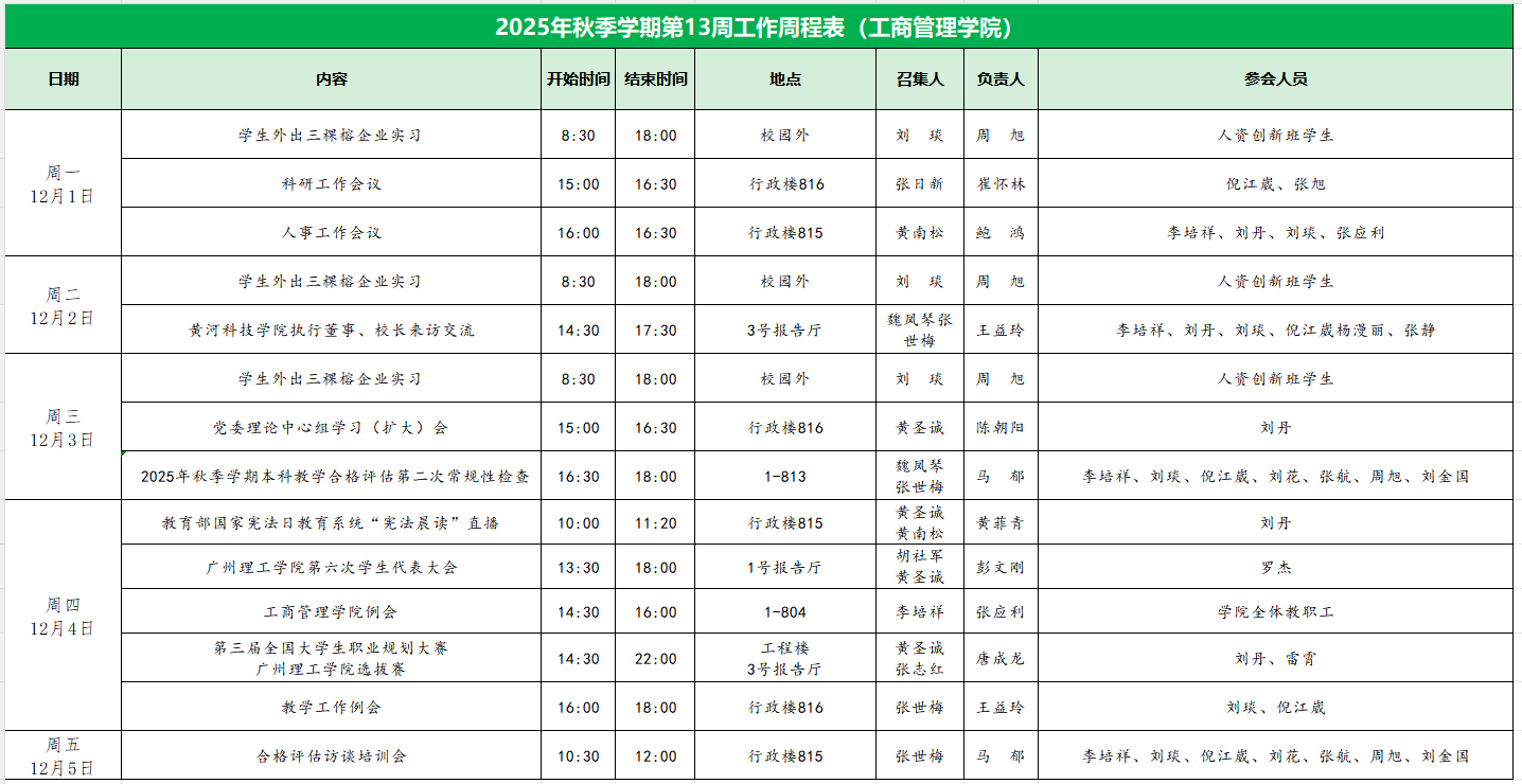 2025年秋季学期第13周工作周程表