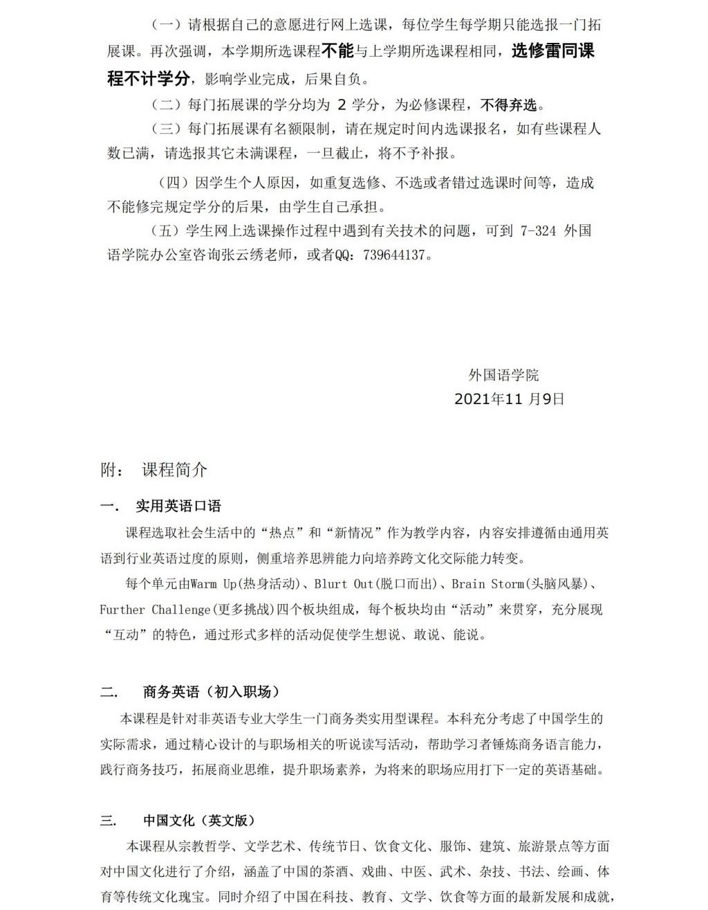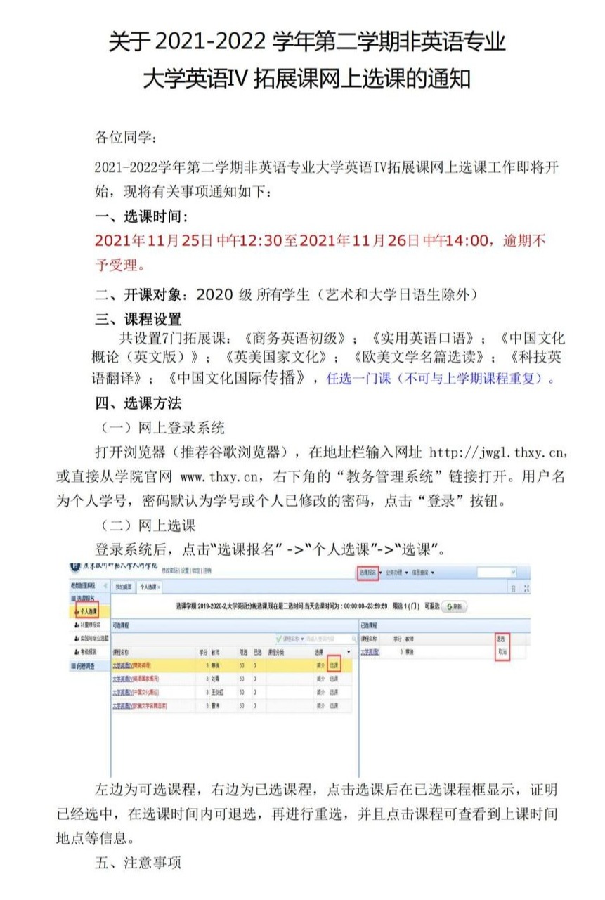 关于2021-2022学年第二学期非英语专业大学英语IV拓展课选课网上选课的通知