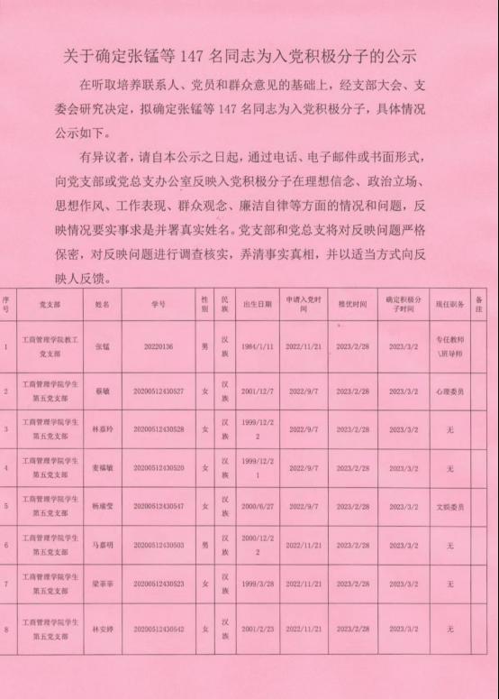 在听取培养联系人、党员和群众意见的基础上,经支部大会、支委会研究决定,拟确定张锰等147名同志为入党积极分子,具体情况公示如下。