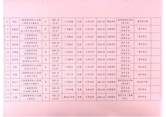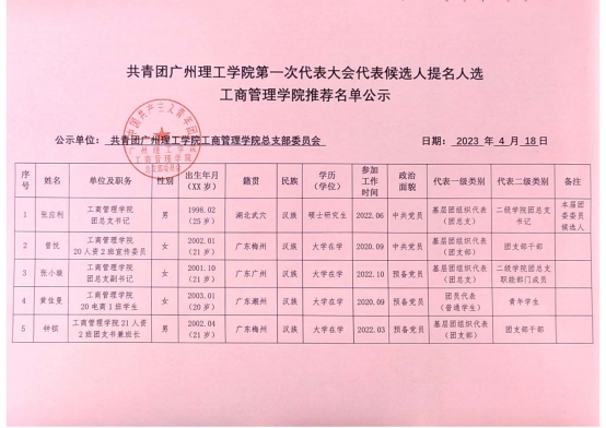 (陈逸杰)为落实《关于做好共青团伟德国际1946第一次代表大会代表推荐选举工作的通知》,切实做好共青团伟德国际1946第一次代表大会代表推荐选举工作,经层层推选、充分协商、组织考察后,现对候选人提名人选予以公示,公示名单如下: