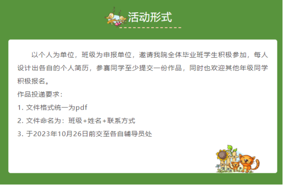 以个人为单位,班级为申报单位,邀请公司全体毕业班员工积极参加,每人设计出各自的个人简历,参赛同学至少提交一份作品,同时也欢迎其他年级同学积极报名。