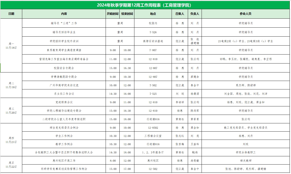 2024年秋季学期第12周工作周程表